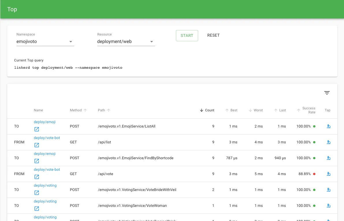 Shows the stream of requests across a single pod, deployment, or even everything in the emojivoto namespace.